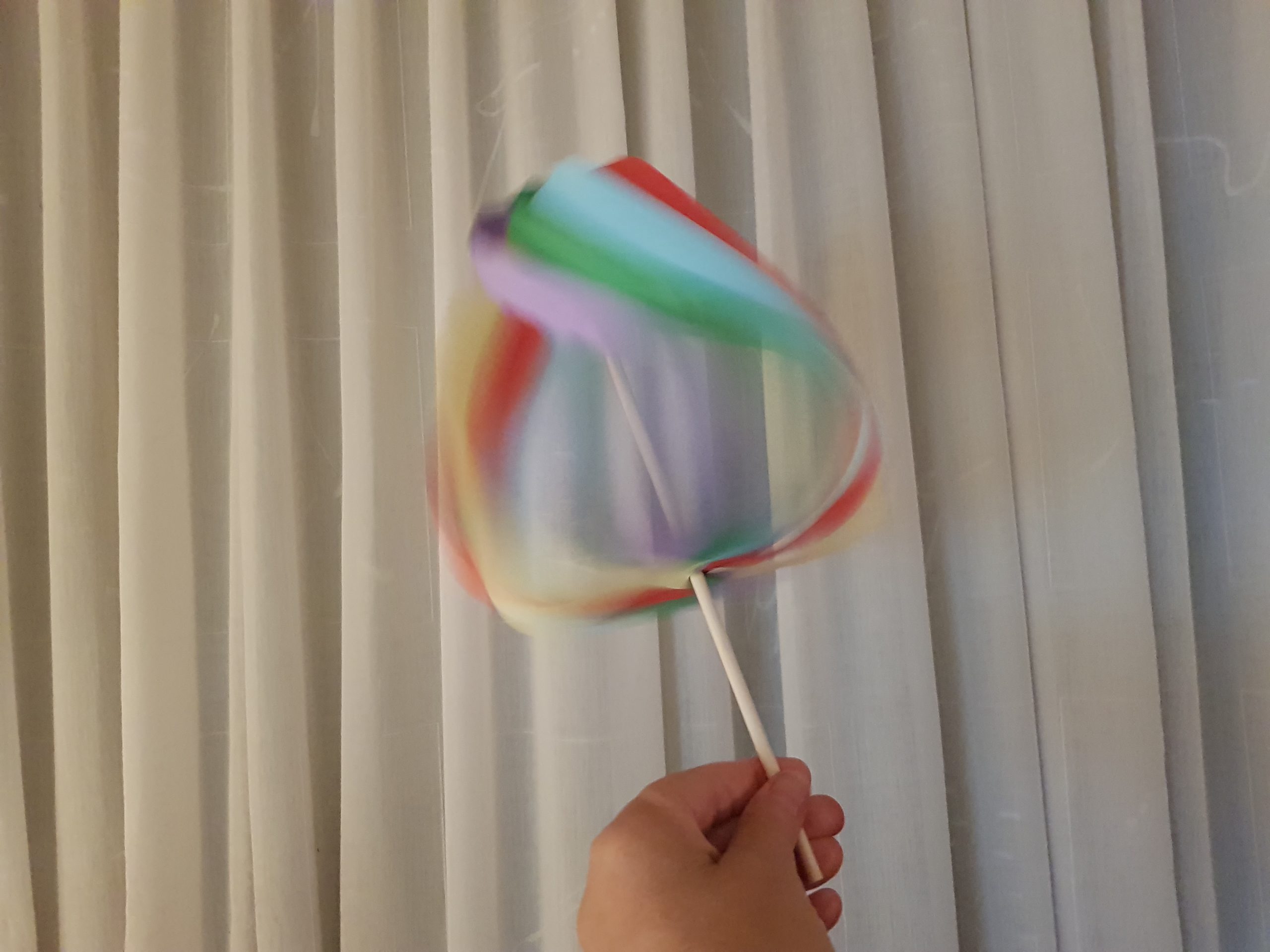 Je kunt op een eenvoudige manier een soort draaimolen maken, van een sate prikker en een aantal stroken gekleurd papier