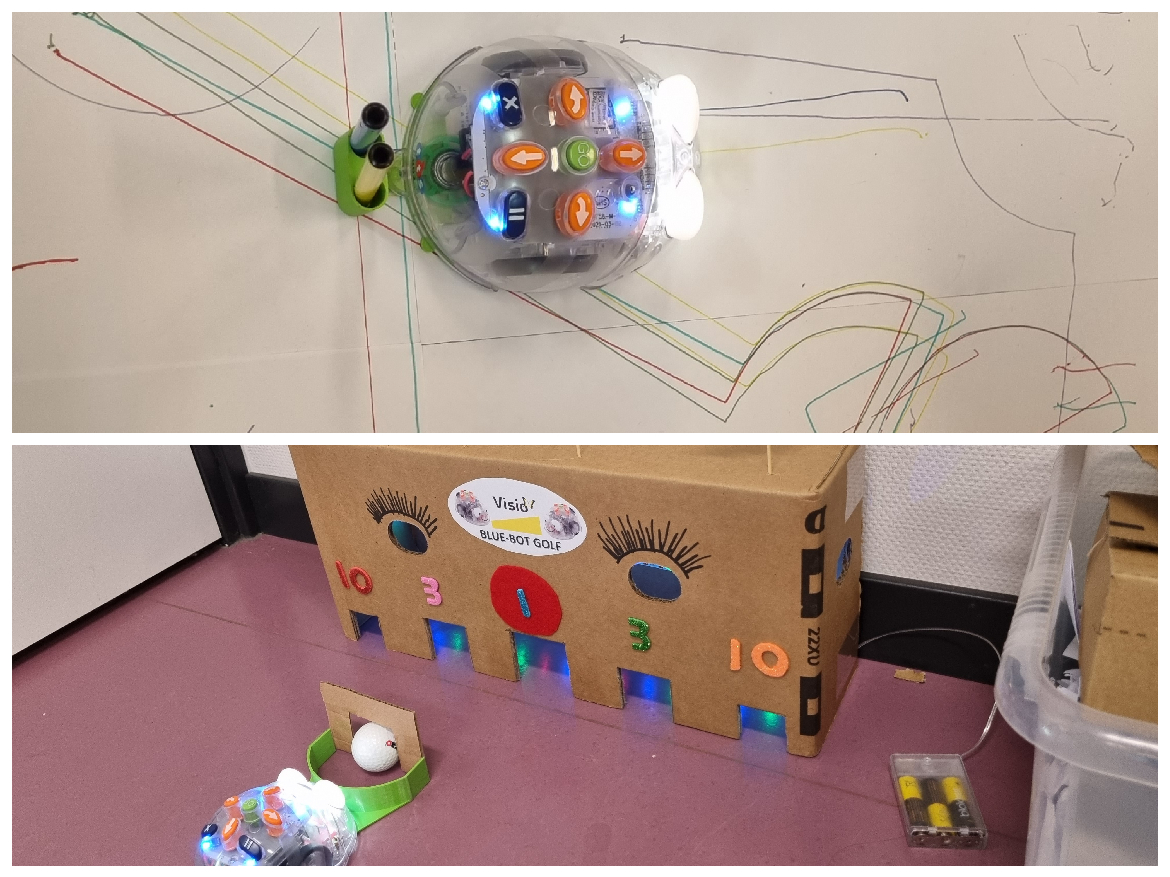 Ik wilde al een tijdje de lessen met de Bee-Bots en Blue-Bots wat uitbreiden. Nu kwam in op Thingiverse een pennenhouder en een duwbakje tegen. Ik weet dat je die dingen ook online kunt kopen, maar ze zelf 3D printen is een stuk leuker. Dus we hebben de pennenhouder geprint (één voor 2 pennen en één voor 1 pen). Ik heb hem direct uitgeprobeerd. Ik moest de puntjes waar je de Bee-Bot op klikt, iets bij schaven, maar iedere stift paster er in, en als je 4 A3 vellen aan elkaar vast maakt krijg je al snel leuke tekeningen. En vooral ook verbazing bij de leerlingen, jeetje hij kan tekenen.
