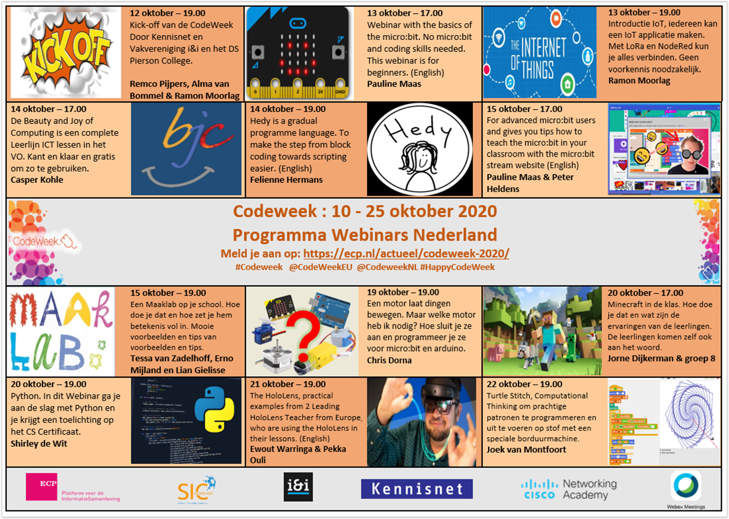 Voor de CodeWeek 2020 heb ik samen met Ramon Moorlag (IenI) een mooie programma gemaakt met 12 mooie webinars. Programmeren