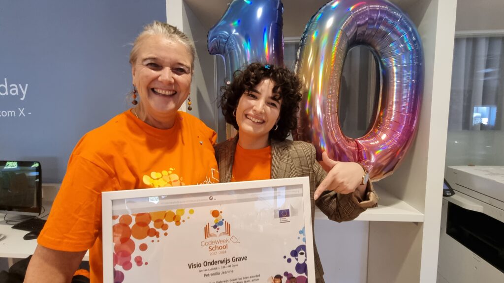 Met trots melden wij dat Koninklijke Visio te Grave nu ook CodeWeek School is. Met grote dank aan Pauline Maas voor al het werk. Onderstaand bericht kregen wij van haar school gestuurd. Op vrijdag 7 oktober stond de KickOff van de CodeWeek in Nederland in het teken van het uitdelen van de Labels CodeWeek School. De Koninklijke Visio School uit Grave was trots dat zij één van de drie scholen zijn die het eerste certificiaat in ontvangst mochten nemen vanuit de handen van Eugenia Casariego Artola (vertegenwoordigster van de CodeWeek Brussel van de Europese Commissie).