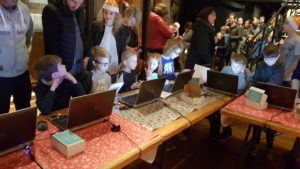 Vlak voor de kerst was ik in het Grand Theater in Groningen voor Coding4Xmas van StartupKid. Het theater was deze twee dagen omgetoverd in een tech-event. Er kwamen veel kinderen op af, die allemaal kennismaakten met de micro:bit met een aantal basis projecten. Ik mocht in het midden staan om de kinderen (en hun ouders) te inspireren met de dingen die ik had gemaakt met de micro:bit. Zo had ik mijn led-schoenen bij me, de auto die je met de micro:bit kon besturen, de oneindige spiegel en alle kerstprojecten van de kerstlessen. Het was een groot leuk feest met veel enthousiaste kinderen (en hun ouders).