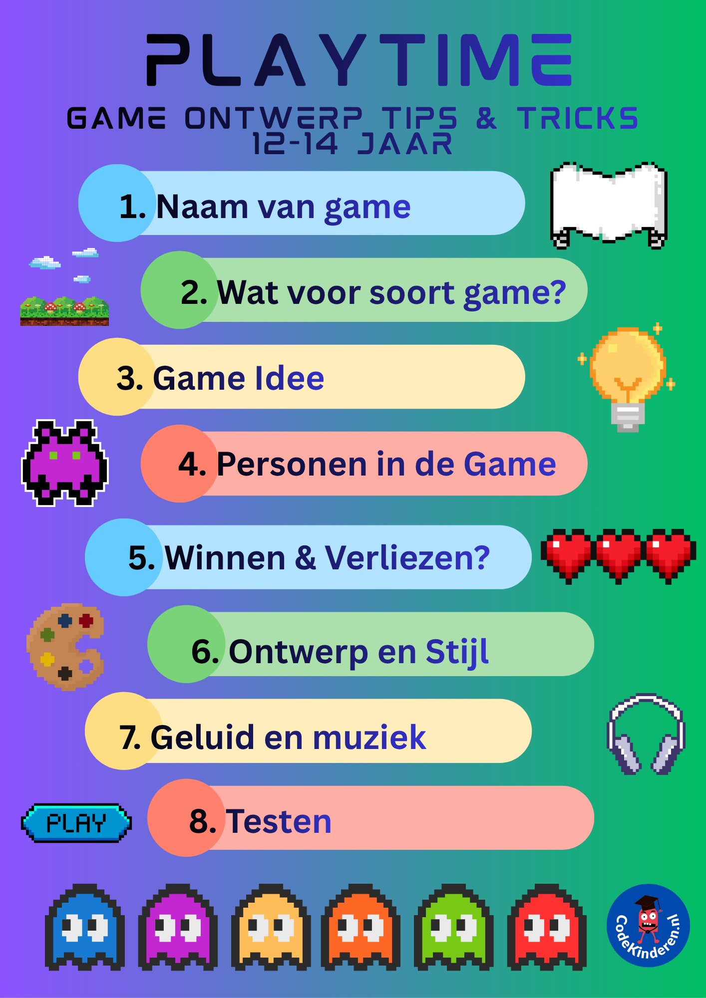 Tevens heb ik haar tips rond GameDesign in een kleine poster gezet. Handig om dit op het scherm neer te zetten als de leerlingen aan de slag gaan om een game te maken. Hier is de PDF om te downloaden.
