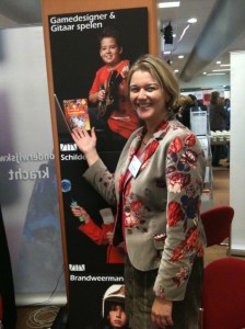 Tijdens HET congres liep in rond op de markt. Dus lekker kijken wat is er nieuw, wat is leuk. En kwam ik bij een standje van VONK bv. Zij maken o.a. foto’s van leerlingen waarin ze vertellen wat ze willen worden. Ik zag toen opeens een foto van een jongen en die had een foto van mijn boek in zijn handen. Hij wilde gamedesigner worden (en gitarist). Ik moest er een beetje om lachen. Raar zo opeens je boekje te zien op zo’n mooie grote poster. Een collega nam snel een foto van me voor de poster.