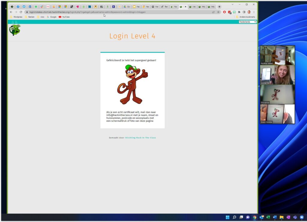 In de les scratch heb ik gezamenlijk met alle deelnemers alle scratch kaarten gemaakt. Dan krijg je dit resultaat. In de les robots is het vaak meer en verhaal en laat ik verschillende robots zien waar je iets mee kunt doen tijdens de lessen. In de les hacken gaan we praktisch aan de slag met verschillende lessen die je in de klas kunt doen zoals hackintheclass, testjewachtwoord, specialagents. Allemaal leuke praktische lessen. De lessen zijn meestal op vrijdag van 10 tot16 uur en dat online. Dat lijkt lang, maar ik vind het altijd jammer als het weer voorbij is.