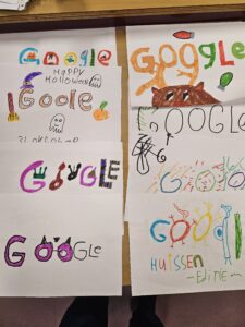 Om de les af te sluiten laat ik de leerlingen altijd zien dat google verschillende logo’s heeft en laat ik ze zelf een logo maken. En als ze daar mee klaar zijn dan mogen ze zoeken naar google eastereggs.
