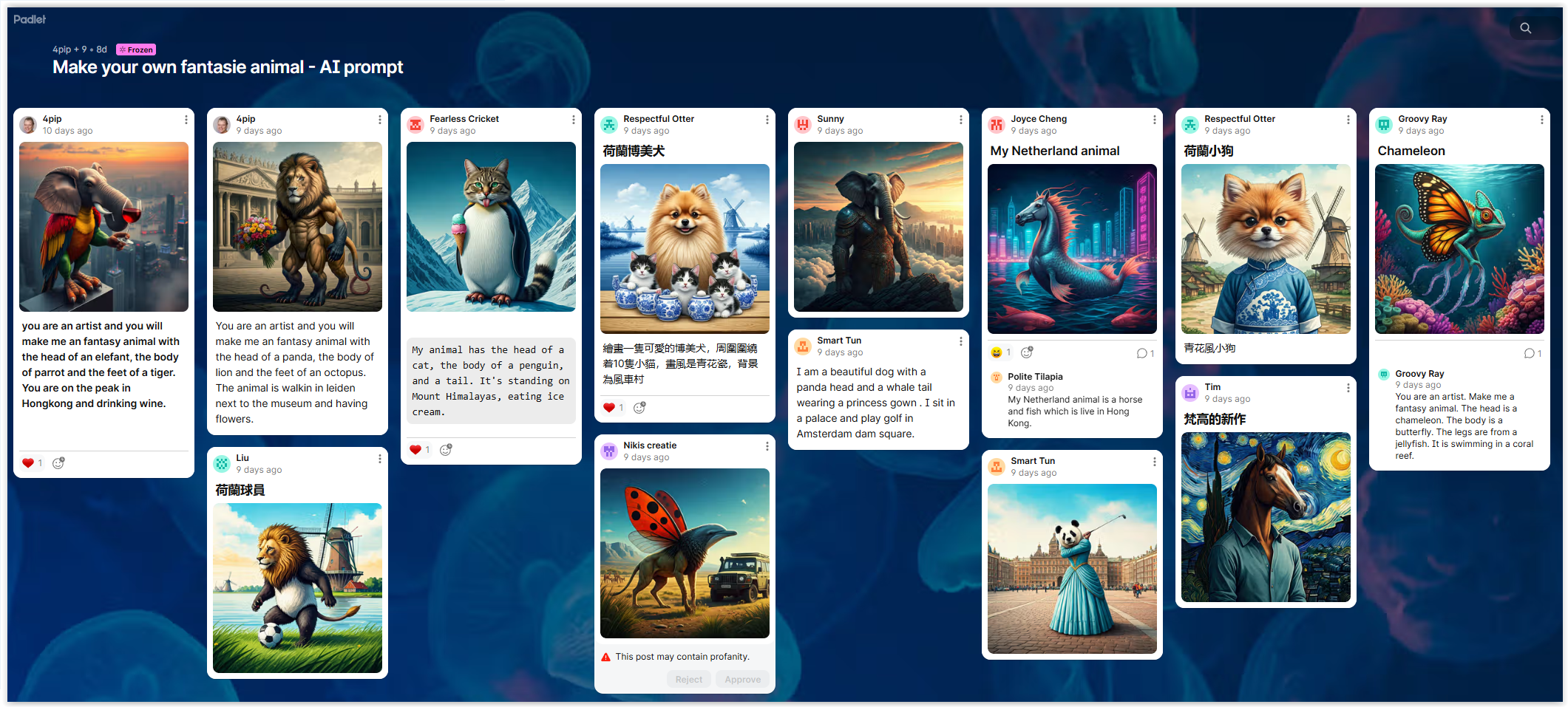 Ik heb eerst een kort verhaal over wat ik doe en wat wij in Nederland doen mbt Digitale Geletterdheid en ik had de poster van DG meegenomen. Die kunnen ze zelf wel vertalen. Toen had ik dit blog geopend waar ik uitleg hoe ik de les geef “maak je eigen Fantasie beest” waarin ze leren prompten. Ik had ook het mooie boek meegenomen van Raoul Deleo met prachtige voorbeelden.