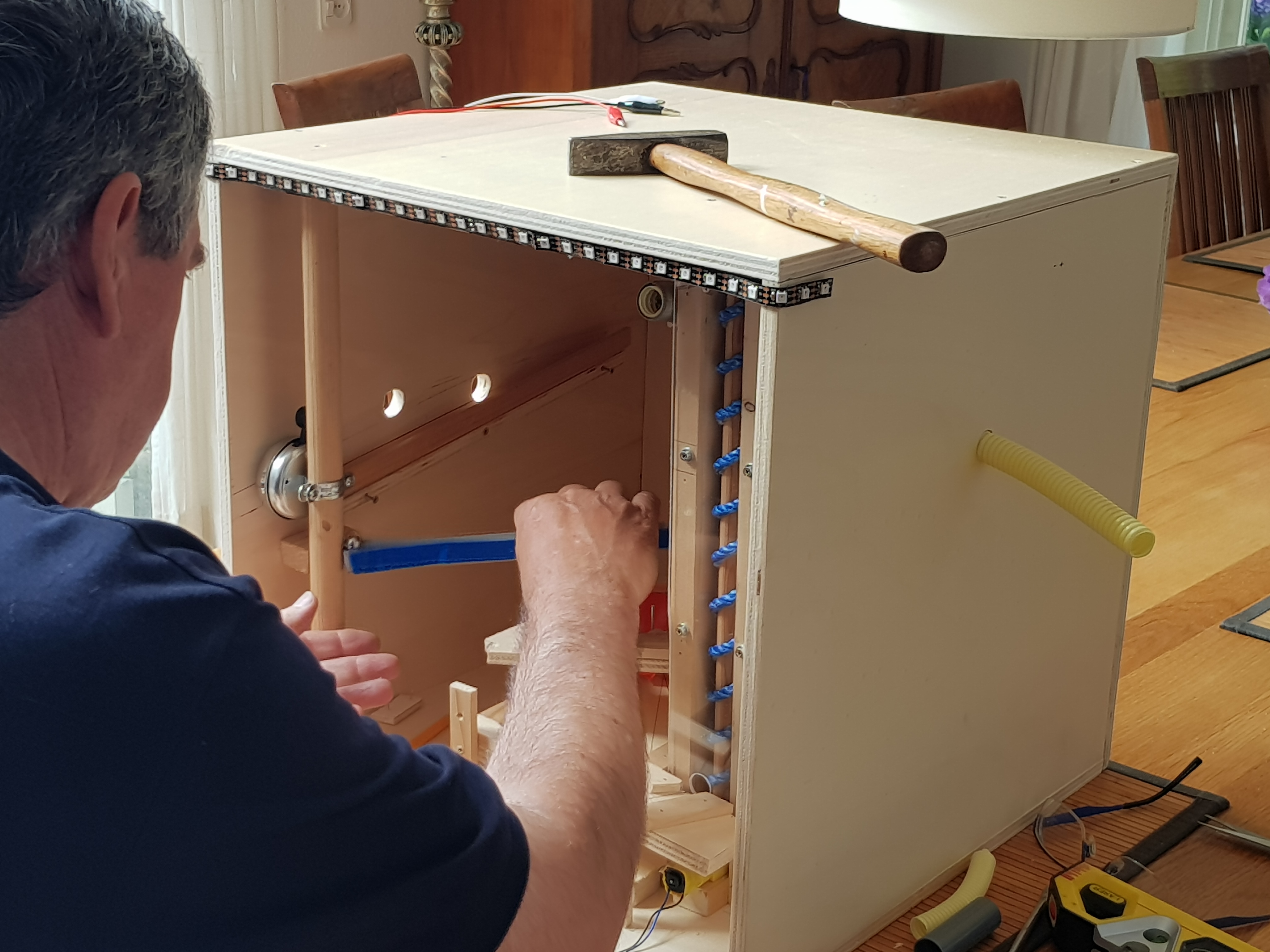 Dus ik heb samen met mijn man een weekend aan de knikkerbaan geknutseld en hem aangepast zodat hij past binnen de nieuwe normen. Wat zijn de veranderingen: een grotere knikker, waar de knikker inkomt en uitgaat is op een andere plaats, hij is minder hoog en minder breed.