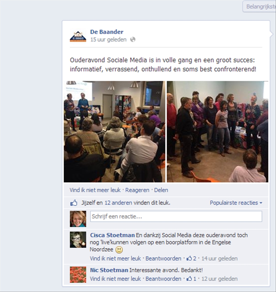 Ik had vorige week een ouderavond op een VSO school in Amersfoort. Een van de ouders zat op een boorplatform op de noordzee. En zij wilde ook graag weten wat ik te vertellen had. Dus de vader had een liver stream operationeel gemaakt. Zodat zij kon mee kijken. Vlak voor dat ik wilde beginnen, knalde het internet het uit. Gelukkig kwam het weer op en met haperingen konden we verder. Een leuke avond. Met veel verschillende ouders en opvoed perikelen. De school heeft een facebook pagina, daarop hadden ze direct wat leuke foto’s gezet van de avond.