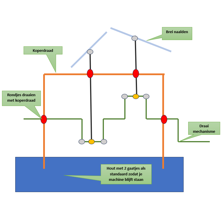 Als tweede maak je met koperdraad het draai mechanisme. Maak eerst de buitenkant (oranje), zorg steeds voor kleine rondjes waar de andere koperdraden door heen kunnen. Hierna maak je de twee houders voor de breinaalden (zwart). Als laatste het draai mechanise (groen), zorg dat je de hoeken om 90 graden zijn. Probeer het uit. buig hem hier en daar nog wat beter en rechter.