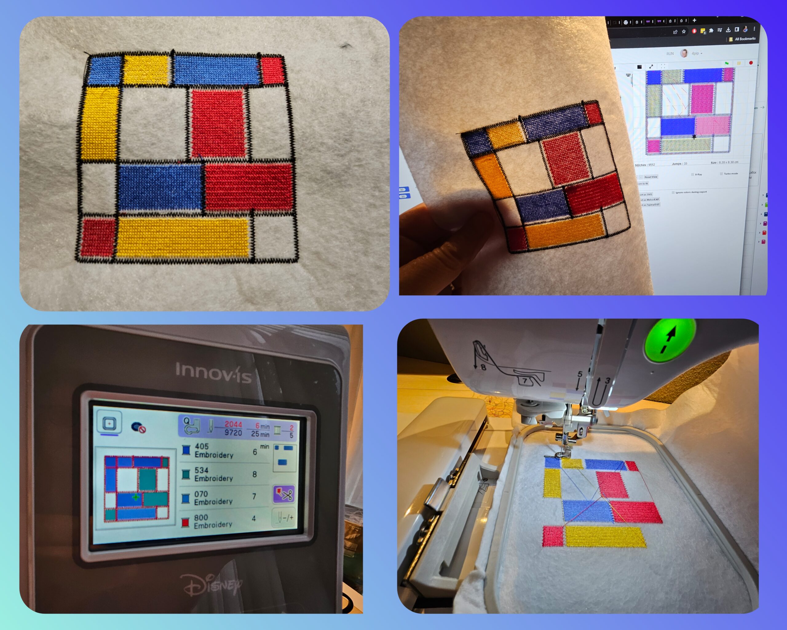 Ik heb het in verschillende subblokken opgebouwd en ik werkt het per kleur af. Na iedere kleur stopt de naaimachine en kun je een andere kleur garen kiezen. Je kunt nog varieren door een ander steek te kiezen. Ik heb een zigzag steek genomen.