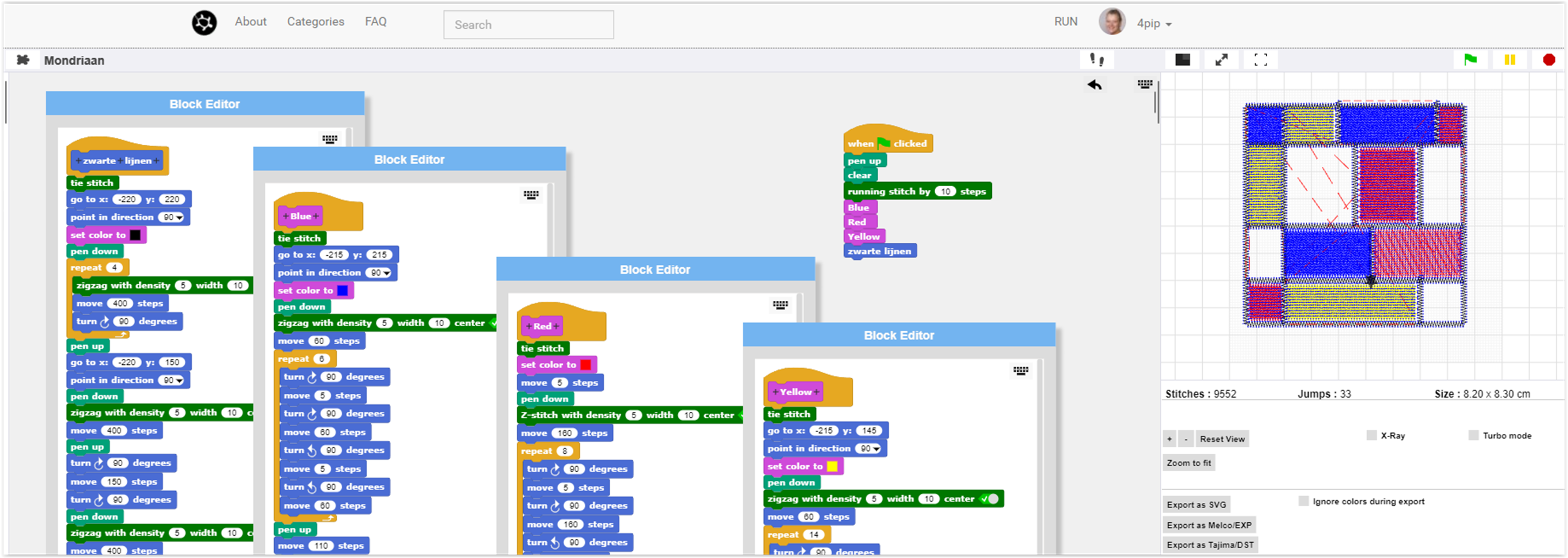 Sinds kort is het nieuw in Turtle Stitch dat je een code kan delen. Hier is de code van deze mondriaan.