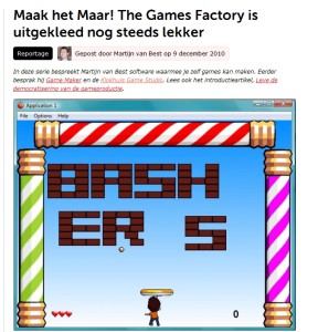 Vandaag kwam er weer een nieuwe aflevering op basher van Martijn, waarin hij allerlei tools onderzoekt waarmee je games kunt maken. Deze keer is het de beurt aan Games Factory. Deze komt heel positief uit zijn test. http://bashers.nl/maak-het-maar-the-games-factory-is-uitgekleed-nog-steeds-lekker