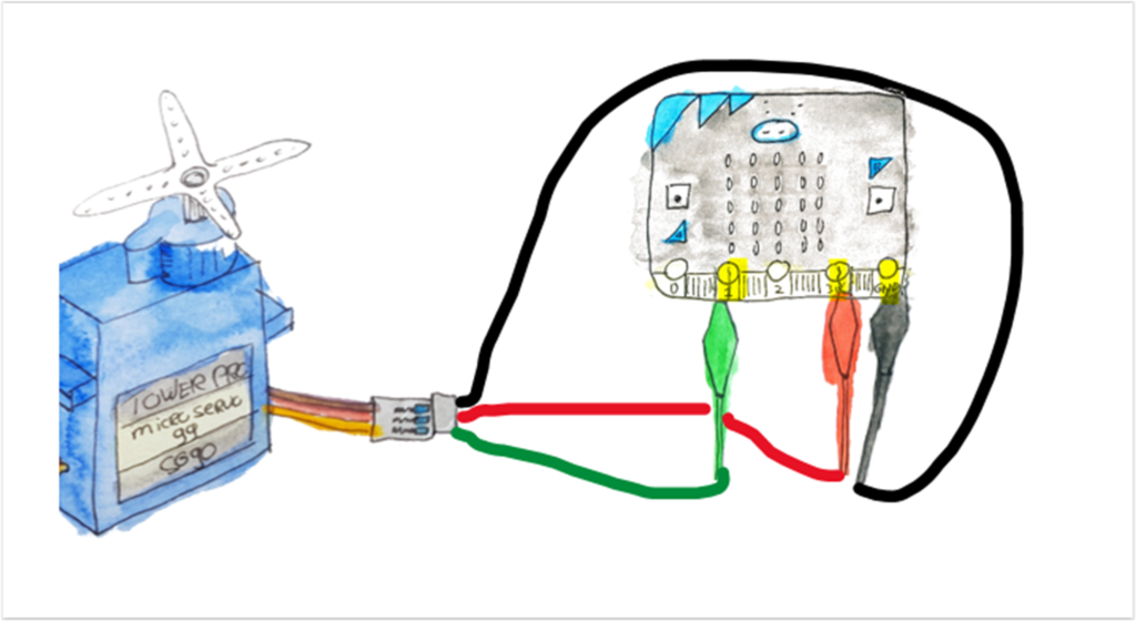 Let op bij het aansluiten van de servo aan de micro:bit dat je de juiste kabels gebruik. Het is handig om de servo te verbinden met de P1, dan kun je de P0 nog gebruiken voor muziek.