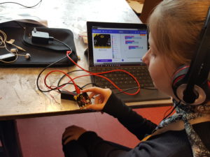 gelopen vrijdag heb ik een aantal meiden de micro:bit gegeven. Ook heb ik 10 kleine projectjes voor de leerlingen op papier gezet. Eenvoudige animaties maken en de dobbelsteen, stappenteller. Deze twee leerlingen gingen enthousiast aan de slag en kwamen tot project 8 in 1,5 uur. Ook hadden ze hun oortje op de micro:bit aangesloten en gingen ze er muziek mee maken. Ze konden niet notenlezen, maar toen we samen even zaten knoppen ze bladmuziek omzetten naar de micro:bit. Zij helemaal trots.