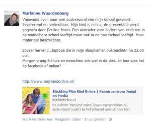 Gisteren weer mijn eerste ouderavond gehad voor Mijn Kind Online. Het was in Apeldoorn op de Heemgaard. Ik had mijn presentatie aangepast. En ik wist van de toren dat ik maar 1 uur mocht spreken. Het was voor dat de ouders met hun mentoren mee gingen. Ik was wel even verbaasd dat ik in de aula mocht. Maar dat was maar goed ook. Want er waren ruim 200 ouders. In het begin een beetje voorzichtig en ik moest er ook weer even in komen. Gelukkig ging het op een gegeven moment wat soepeler. De school erg tevreden. En er zat ook nog een bekende in de zaal. Die zette nog wat leuks op haar facebook.
