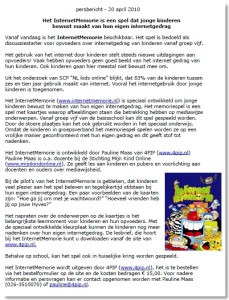 Vandaag 20 april is het persbericht van het internetmemorie spel uitgegaan. Best spannend allemaal. Hopelijk komt er nu heel veel op mij af. En gaan die memoriespellen vliegens vlug de kelder uit. Ik merkte al snel dat het veel getweet werd. En ook kwam het al directop een aantal website’s te staan. Waaronder die van Vives. Daar was ik al heel blij mee. Klik hier om het persbericht te dowloaden.