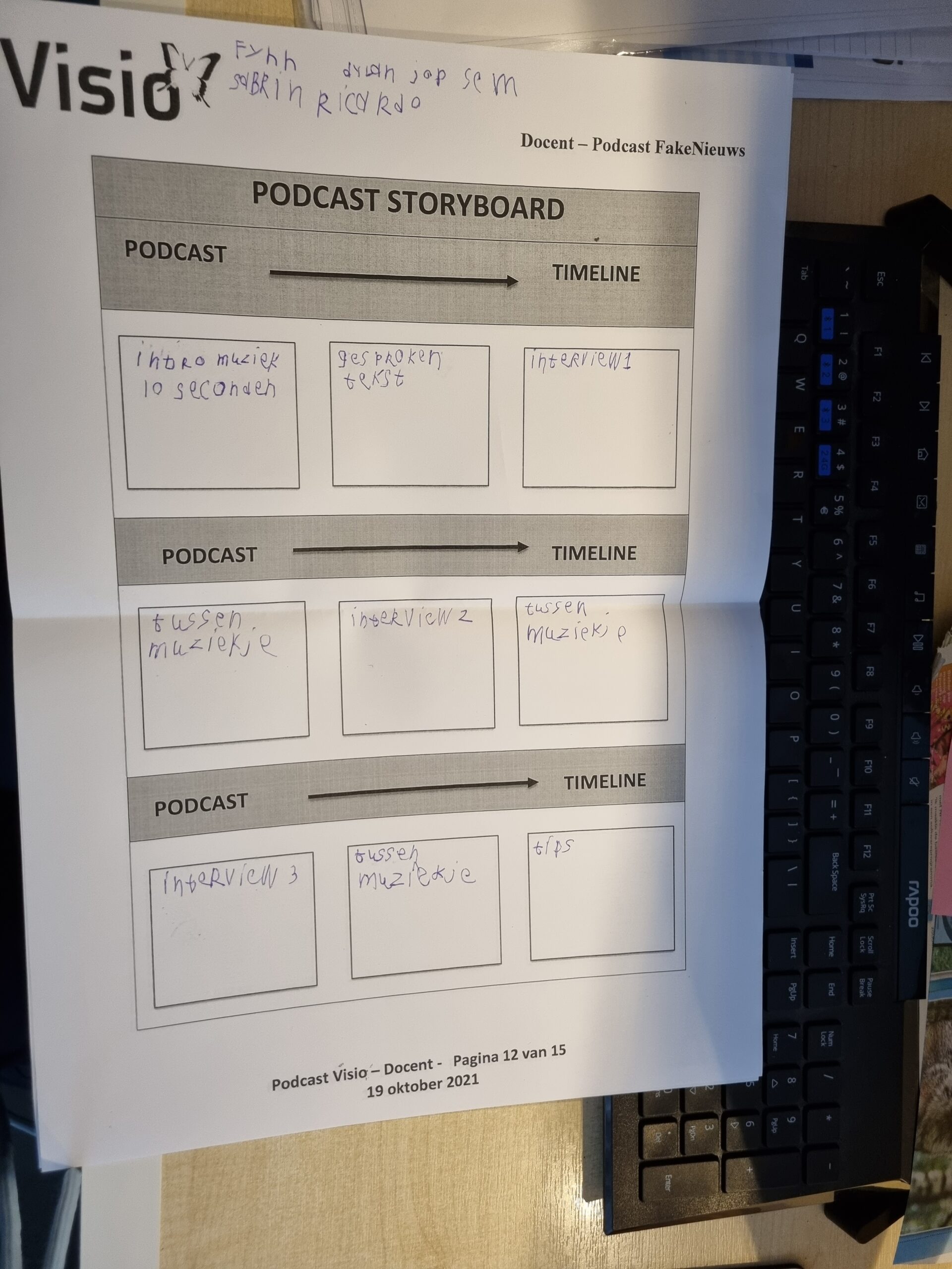 We zijn intussen al best ver en de leerlingen gaan het doen over fakenieuws, we hebben 2 mensen die we mogen interviewen en ze gaan ook een leerling interviewen. In de nederlandse les krijgen ze les over vragen stellen. Ik heb deze week het storyboard met ze gemaakt voor de podcast en de rollen zijn verdeeld.