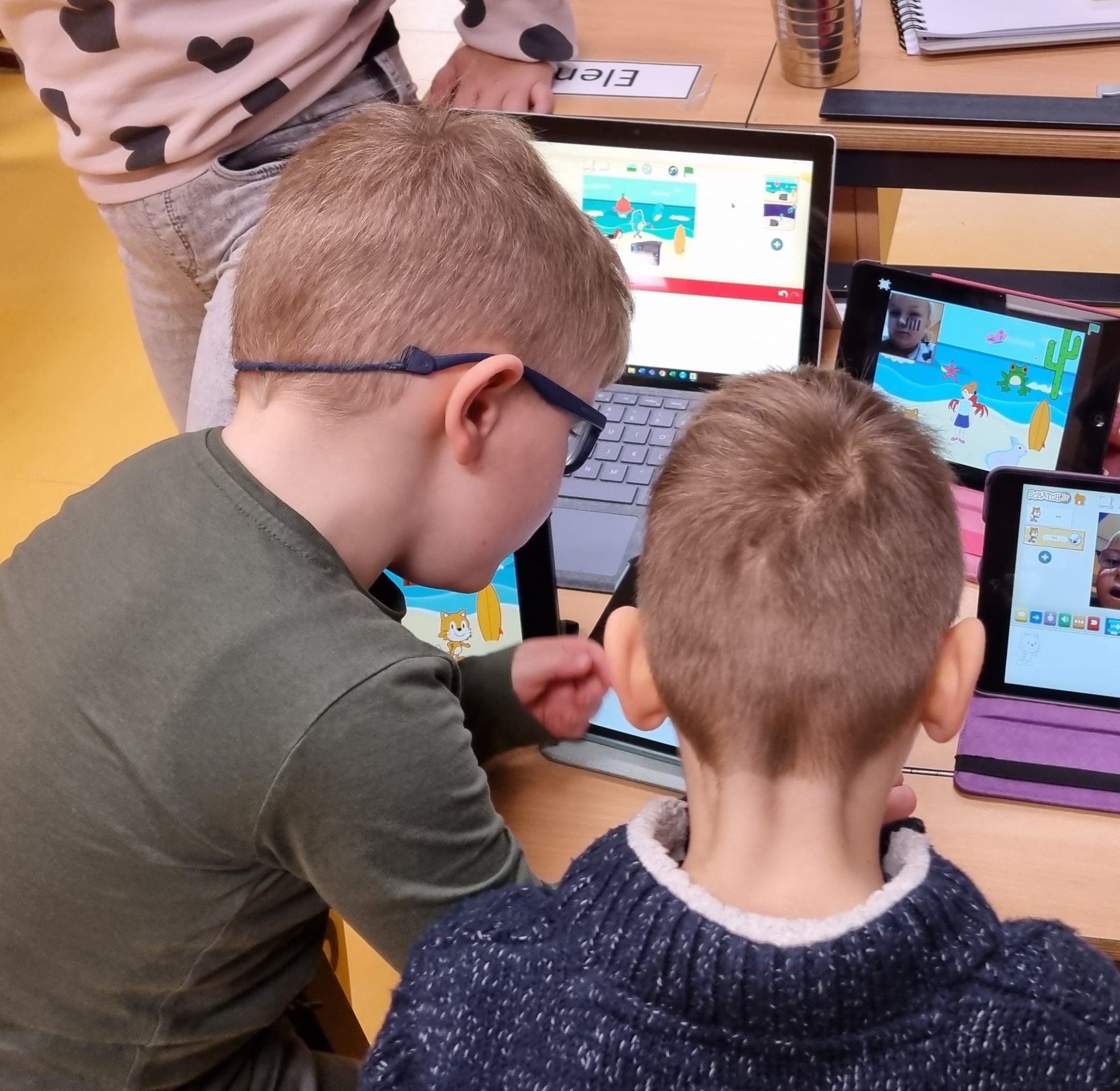 Alle klassen krijgen van mij een aantal lessen rond programmeren (Computational Thinking) en de andere poten rond Digitale Geletterdheid. Deze maand was ik in het SO en hebben we met Scratch-jr leuke verhalen gemaakt. Scratch-jr is heel handig en heel creatief. Het is een app (hoewel er ook een beta is die je kunt downloaden) en hij is gratis. Er zijn mooie startkaarten, maar meestal doe ik met onze leerlingen alles uitleggen in kleine stapjes, kijk zo kan je poppetje lopen. Zo kunnen meer poppetjes lopen. Zo kun je een achtergrond maken. Maar het leukste vinden ze toch echt eigen geluiden in scratch toevoegen en een poppetje maken met je eigen foto. En als laatste dan bekijken ze elkaars verhaaltjes. Een volgende les zou kunnen zijn dat je verteld wat er allemaal in het verhaaltje moet zitten. Bijvoorbeeld: minimaal 3 poppetjes, 3 achtergronden, de poppetjes moeten bewegen, praten met geluid en tekst.