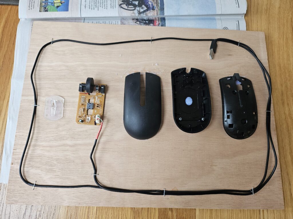 Ik wilde ook graag een muis uit elkaar halen. Dit zijn maar een paar onderdelen. Maar ook weer een moederbord, natuurlijk het wieltje om te draaien en de knoppen die je kunt indrukken. Voor de rest zit er niet een schroef in.
