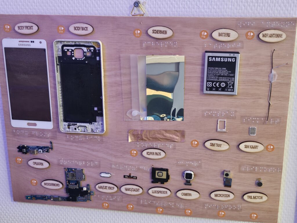 Ik heb met mijn leerlingen een aantal oude telefoons uit elkaar gehaald. Het was geen gemakkelijk klusje en er zijn verschillende telefoons gesneuveld, voordat we er achter kwamen hoe het moest. Ook hier merkte we dat het scherm bestaat uit een aantal onderdelen. Ook is het leuk om te zien wat is nu de speaker en de microfoon. En natuurlijk zit er een trilmotor in. Ik voeg dan houten bordjes toe, braille op plastic en ook met een voorlees pen voeg ik stickers toe, zodat de pen voorleest wat het is, als je het op de juiste sticker zet.