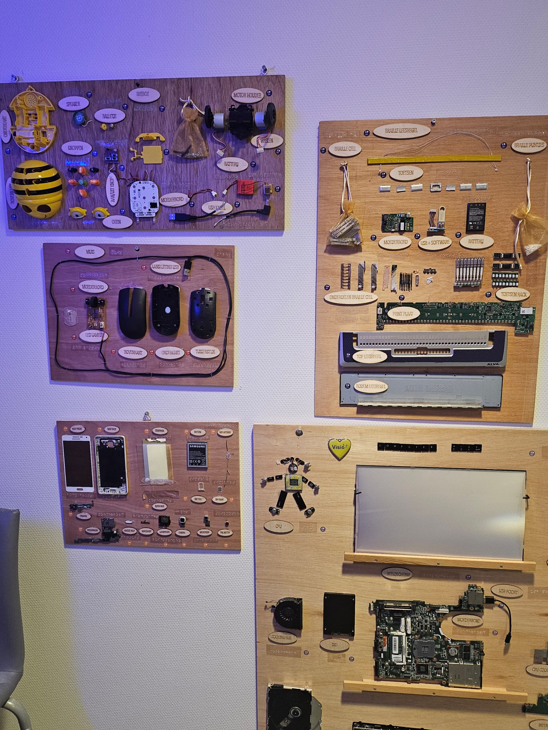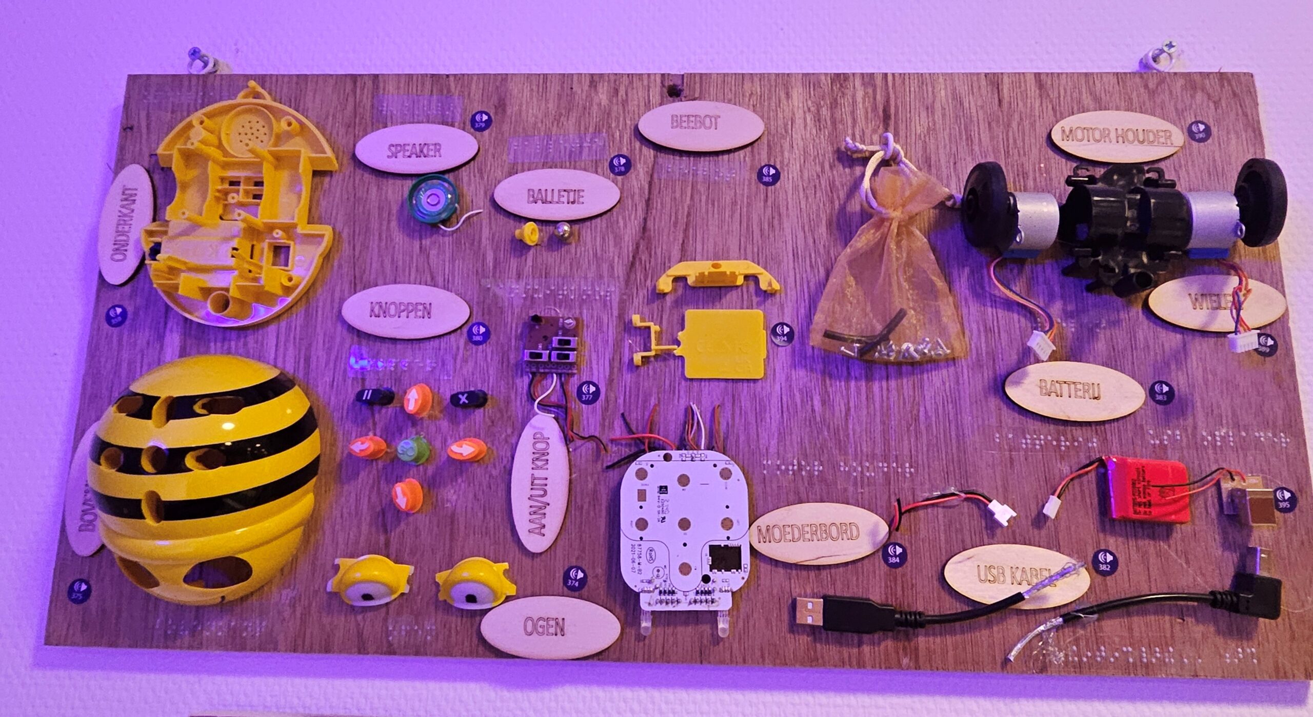 Bij de onderdelen maak ik met de lasercutter teksten, ik voeg ook braille toe op plastic en ik plak er stickers bij waar je met de voorlees pen de onderdelen kan voorlezen. Soms kun je onderdelen van het bord afhalen.