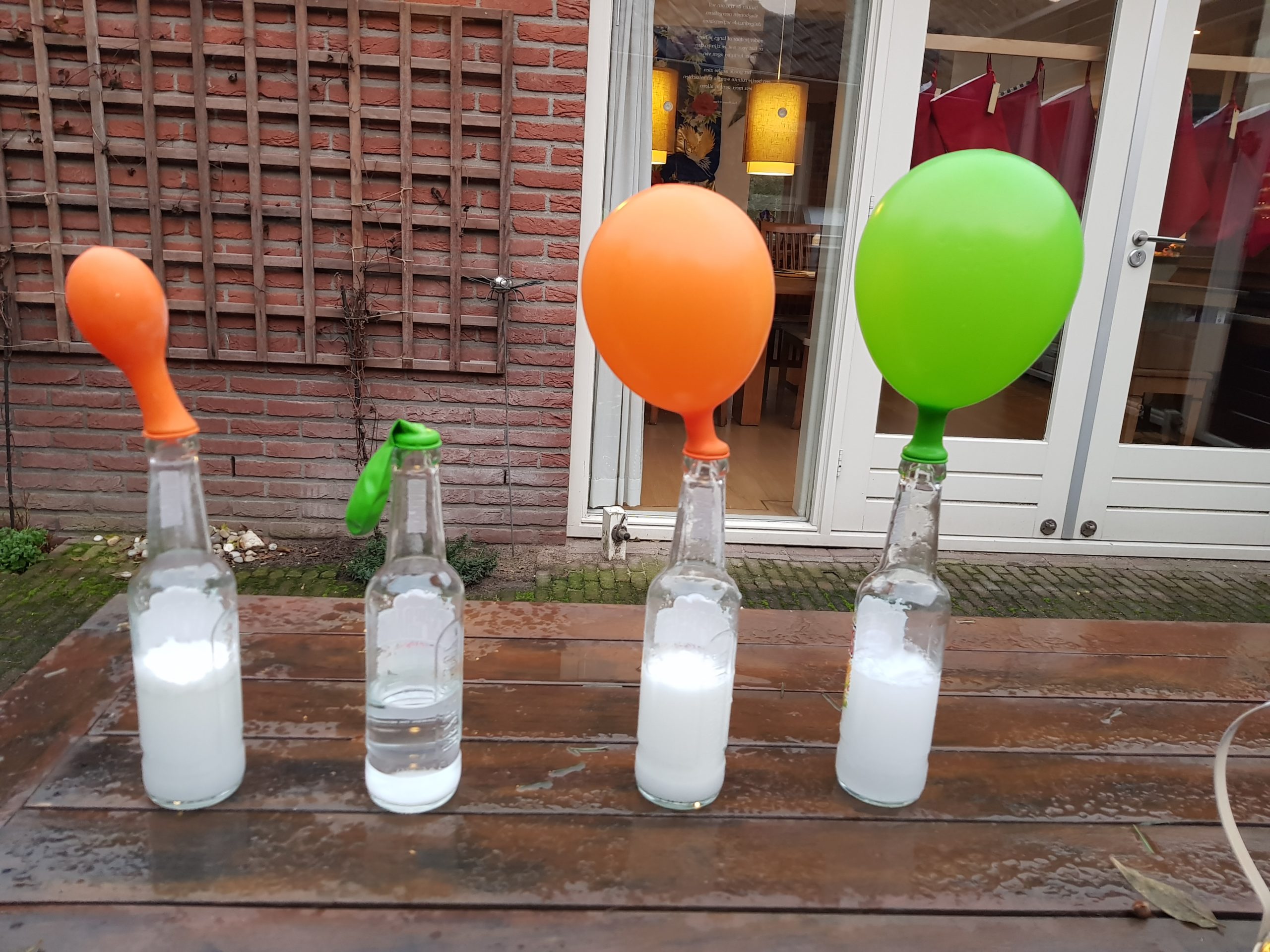 Met wat ballonnen, bakpoeder, bak soda en azijn kun je een leuk proefje doen. Doe het wel buiten. Link