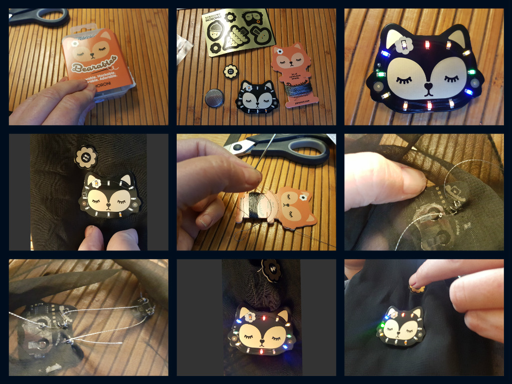 Via twitter (@LMcUnderwood) zag ik een ontzettend leuk lichtgevend vosje voorbij komen. Ik heb hem direct besteld bij Pimoroni. Hij was binnen een paar dagen bij mij thuis in een leuk doosje. Een klein broche met led lampjes, een knoopcel batterij, geleide draad en naalden. De broche doet het direct als je de batterij er in stopt. Met een stukje stof kun je aan de slag. Op het doosje staat een korte instructie. Je moet eerst één kant van het de broche vastzetten en het hierna verbinden met één kant van de sensor. Hierna de draad afhechten en dan de andere kant van de broche verbinden met de andere kant van de sensor. De broche werkte maar niet met de sensor, dat was even proberen en kijken op de site. Het bleek dat ik de aan en uit knop even wat langer ingedrukt moet houden, dan ziet hij de sensor en kun je de broche aanzetten met de (licht)sensor.