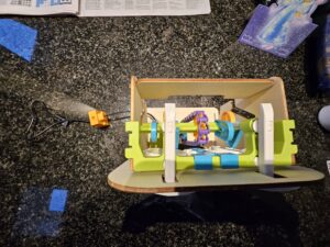 Toen hij in elkaar zat, was het tijd om hem te versieren. Nu vond ik het wel leuk om hem een beetje aan te passen aan de kerst. Dus ik heb er een Kerst Rendier van gemaakt. Het was leuk om te maken en hij zat snel in elkaar. Mijn handen jeuken nu om hem uit elkaar te halen en er ipv deze motor en de 3D geprinte materialen te vervangen door een lego geek servo motor en met een micro:bit aan te sturen. Afijn als ik tijd over heb.
