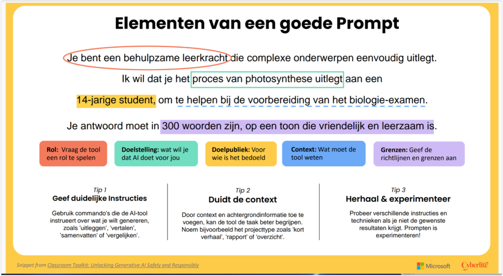 Deze poster komt uit de Classroom Toolkit: Unlocking Generative AI Safely and Responsibly En er is een online cursus op Microsoft Learn. Het materiaal is vertaald in het Nederlands.