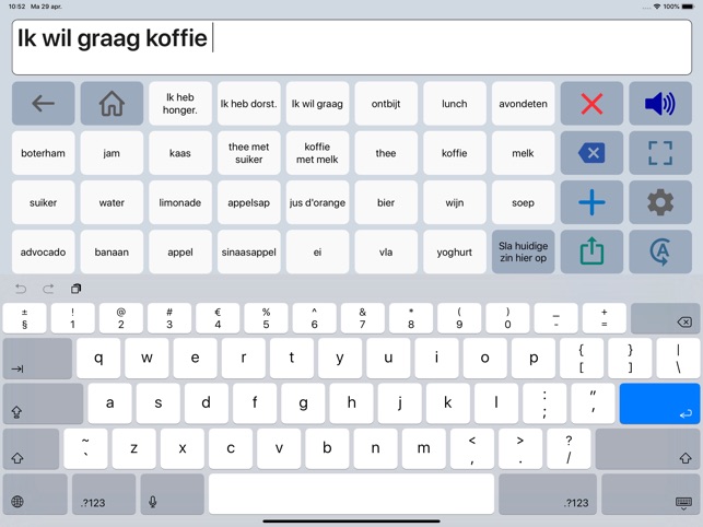 We vonden de app Spraak Assistent. Hij werkt op IOS (14,99) en Android (gratis, kan upgraden voor meer functies). Je kunt kiezen voor verschillende onderwerpen en met één klik spreekt hij het woord uit. Ze kan ook eigen standaard zinnen opslaan. Je kunt werken met de gratis versie, maar er is natuurlijk meer functionaliteit in de betaalde versie.