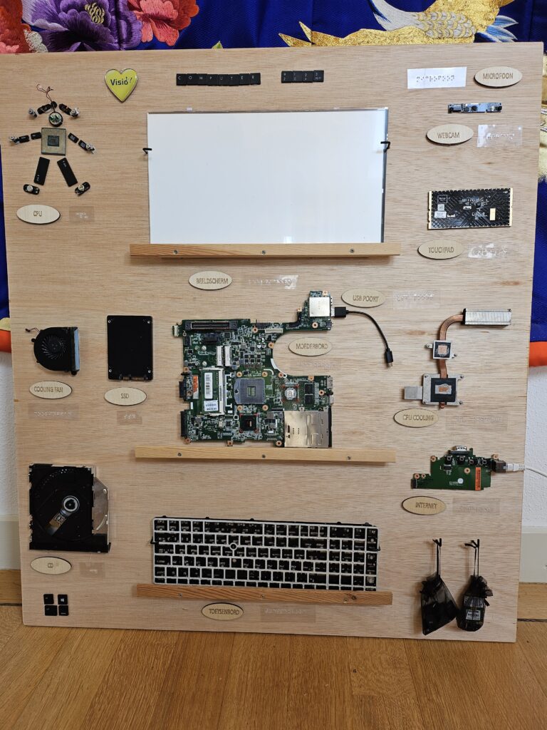 In het laatste blok voo de zomervakantie heb ik met leerlingen uit de tweede een laptop helemaal uit elkaar gehaald. Ik heb goed opgelet dat het scherm zo uit elkaar werd gehaald dat de verschillende lagen niet kapot gingen. Zo ook met het toetsenbord. Ik had toen al het idee om hier een soort voelbord van te maken wat ik kan meenemen in de klassen zodat de leerlingen de verschillende onderdelen kunnen voelen. Met behulp van manlief heb ik een mooi bor gemaakt met opstaande randjes waar het “scherm”, moederbord en toetsenbord op kan staan. Met de lasercutter heb ik bordjes gemaakt, de onderdelen zijn ook in braille op het bord geplakt en ik heb ook nog speciale stickers bij de verschillende onderdelen geplakt zodat een speciale pen de onderdelen worden voorgelezen.