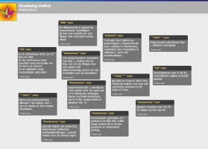 Vorige week was ik op een Dalton School in Voorburg voor een studiemiddag met Docenten. Deze docenten hadden veel eigen laptopjes. En in mijn workshops hadden we een paar momenten dat ze moesten overleggen. Zo heb ik ze laten brainstormen in WallWisher. Op deze website kan ik een online prikbord aanmaken en andere kunnen er via de link gewoon wat opschrijven. Hij update automatisch. En toen we het gingen bespreken kon iedereen direct mee lezen. Een eenvoudige samenwerking tools. Zonder veel gedoe. Na afloop van de workshop, heb ik ingesteld dat mensen er niets meer op kunnen schrijven.