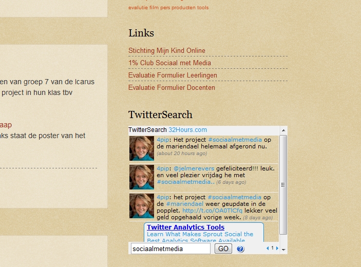 Deze week heb ik weer wat dingen aangepast aan het weblog van Sociaal met Media. Ik heb er een evaluatie formulier opgezet. Wat kun je toch op een eenvoudige manier een formulier maken met Google Docs. Alles komt mooi in een spreadsheet terecht. Ook heb ik de “oudere” projecten ook op het log gezet. Deze kun je zo mooi antidateren. Ook een andere tweeter feed opgezet. Waarmee ook kunt selecteren op onderwerp. En niet alleen op twitter naam.