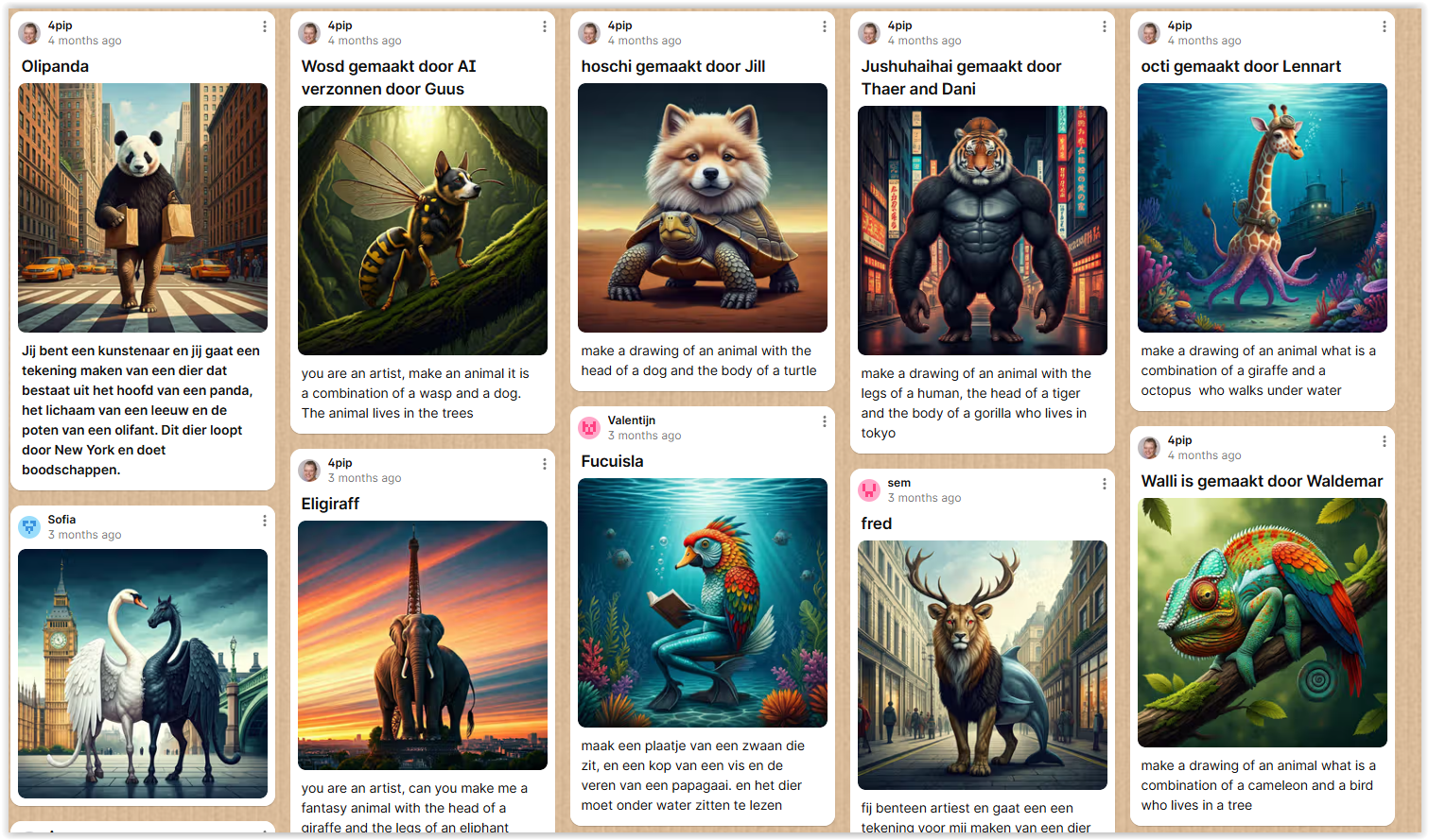 Na een korte presentatie gaan de leerlingen aan de slag met de lesbrief. Ze denken na over AI en tekenen een fantasiebeest met AI waarna we dit fantasiebeest op een padlet met AI gaan prompten. We kijken naar elkaars resultaat en proberen de prompt steeds beter te maken.