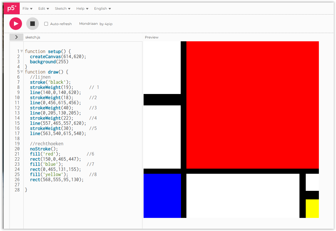 Met de website P5.JS kun je direct aan de slag om te gaan tekenen met code. Je gaat deze code schrijven in javascript. Je kunt met een leeg canvas beginnen of je kunt een bestaande canvas aanpassen.